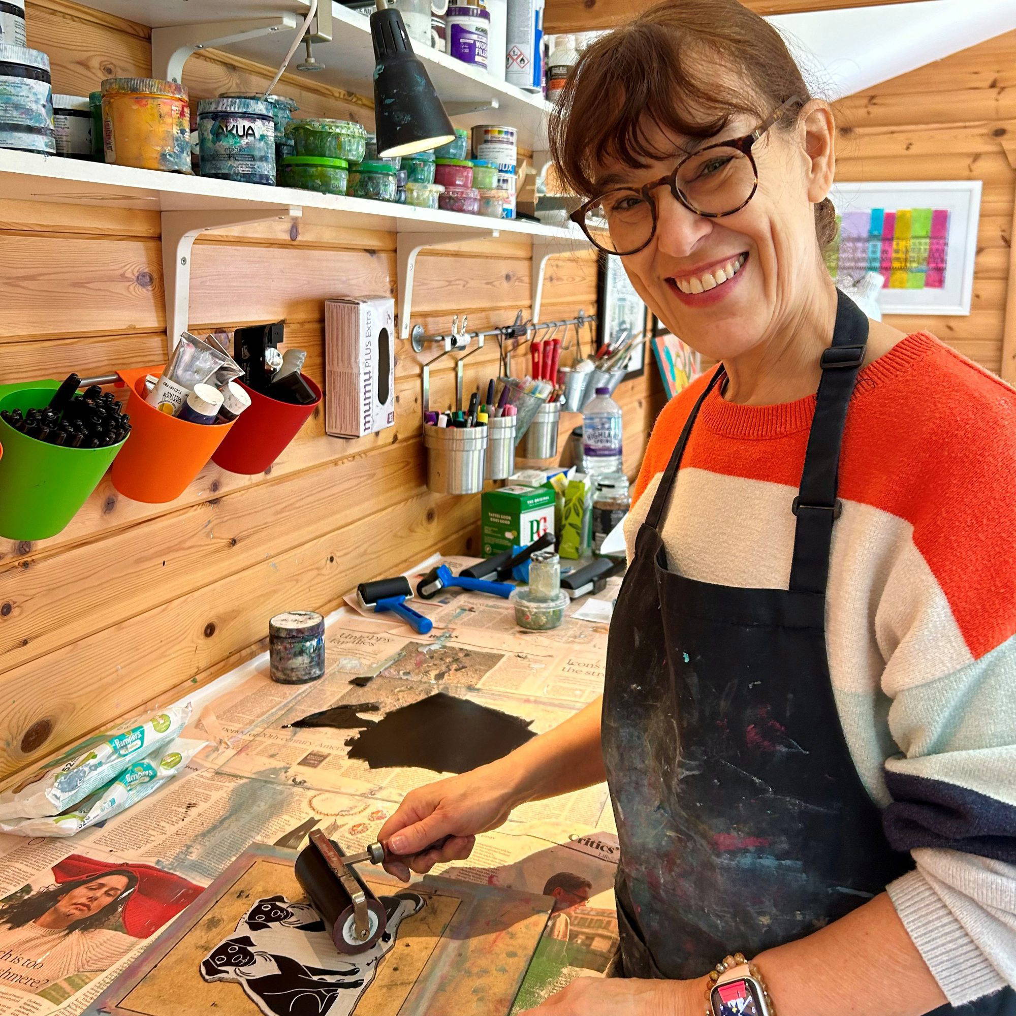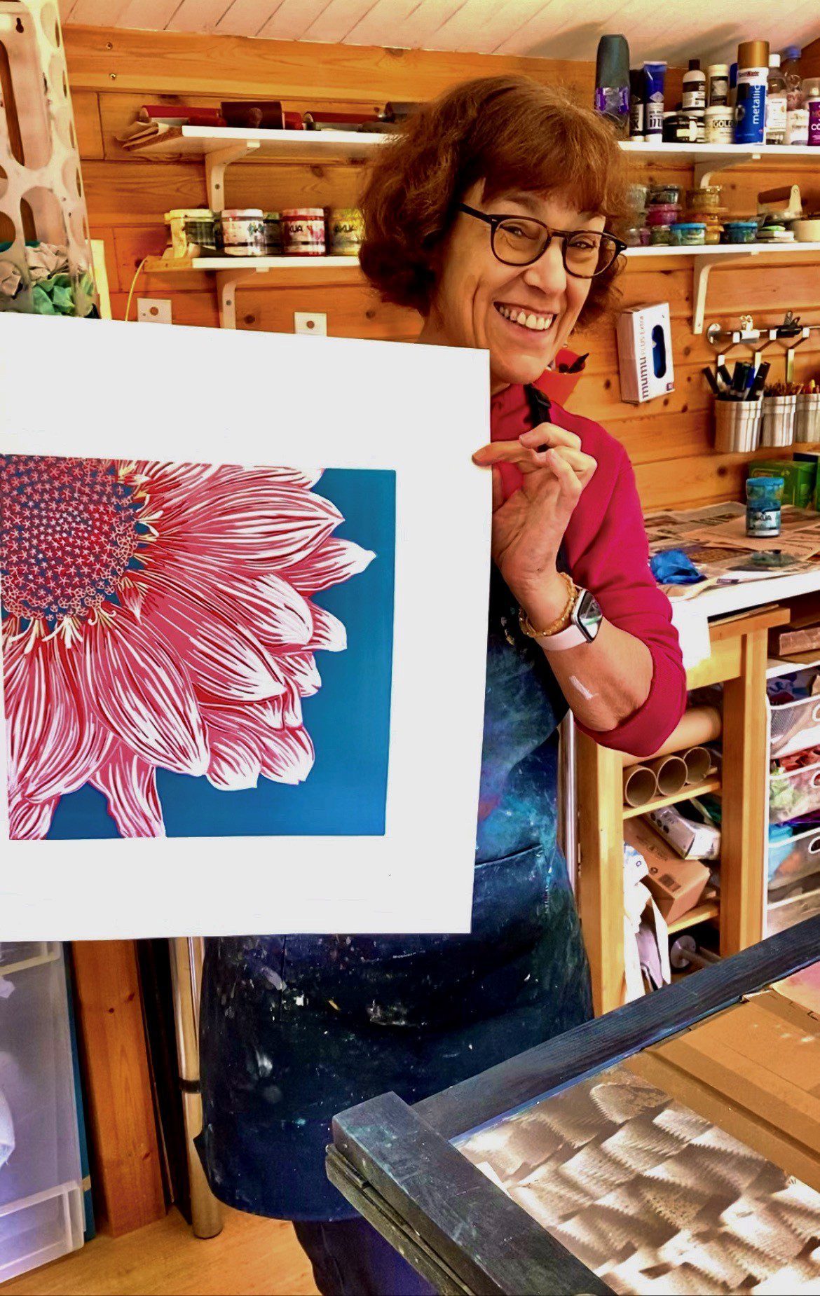 I am a printmaker who loves to create lino cuts in one colour or lino reduction prints in lots of colours! I have always loved to paint, but discovered lino printing when visiting an open studio many years ago. I soon booked up a few workshops and haven’t stop printing since then – I am hooked!