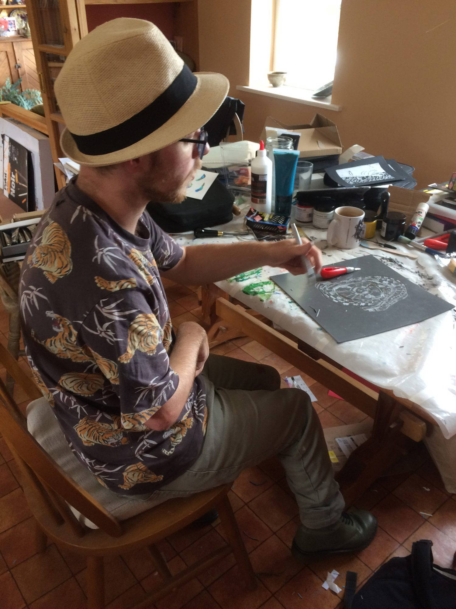 I wake up at 5:30 each day as it takes me a while to reconnect with my body after a night of rest. I make myself an Earl Grey and take up my pen or my Lino cutter and begin to carve. I like waking up so early as I’m able to watch the light change through the trees in my garden.