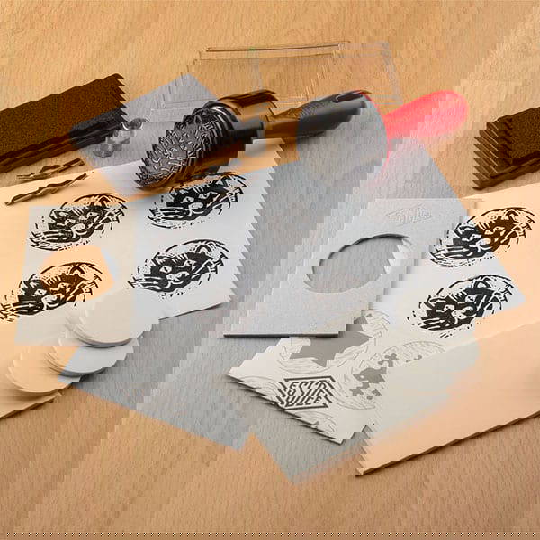 Carve, Ink and Print your own stamps with this all in one stamp carving kit. This fun kit comes with a selection of five self-adhesive MasterCut printing stamps which can be stamped with the Baren stamping tool, and a piece of our 4mm MasterCut stamp carving material which can be used to carve larger stamps, just like carving a big eraser. Simply ink up your creations with the ink pad and get stamping! Includes Lino cutters No.1 and No.2 and instructions. Packs of 10 self-adhesive printing stamps are also available separately