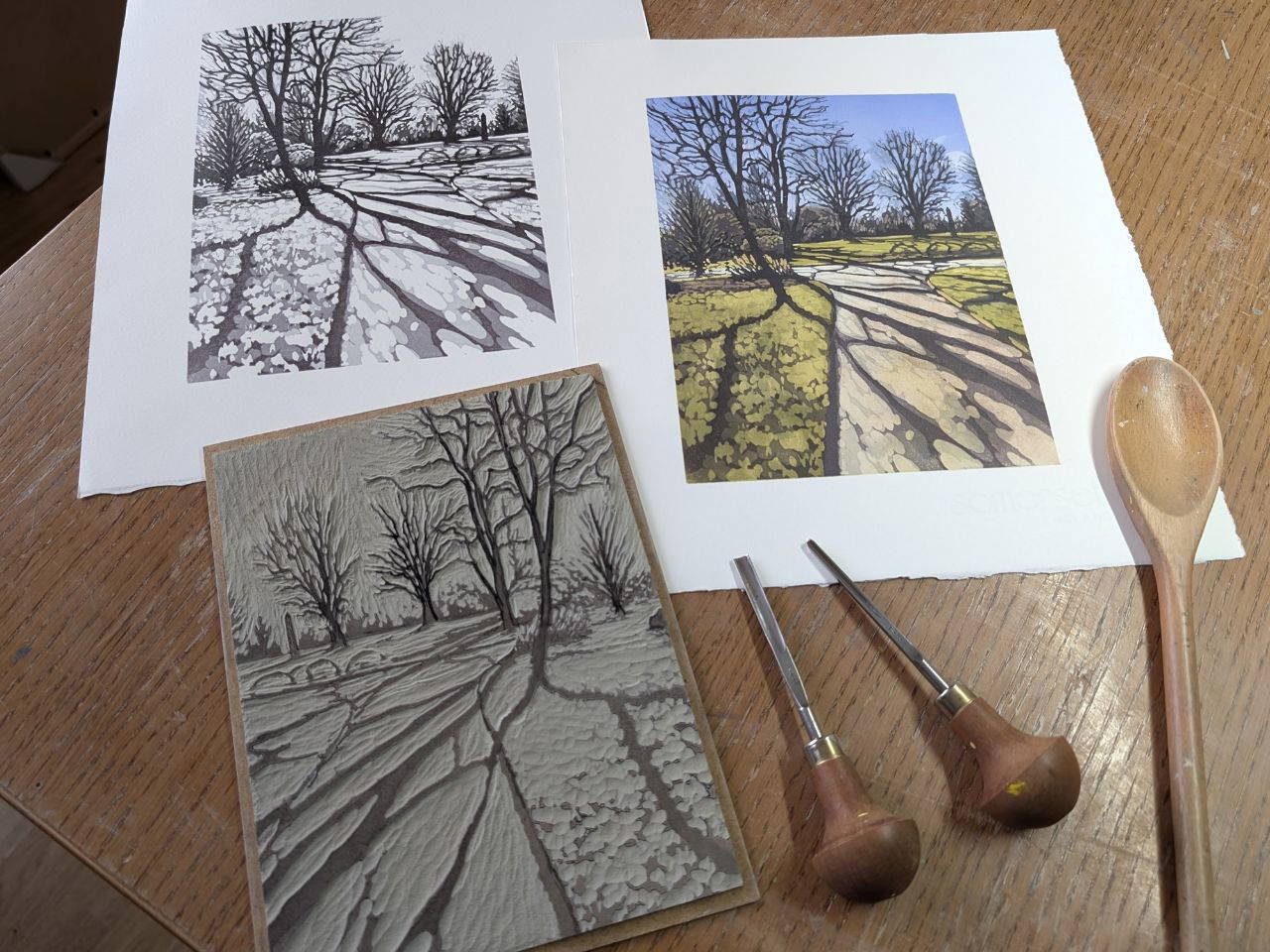 I get my inspiration when I am out and about on local walks or on trips away. I take photos of subjects that interest me on my phone camera, composing the lino then and there. I am attracted to scenes with bright light and dark shadow such as sun streaming though trees or tree shadows on the ground. I also enjoy bluebell woods and carpets of flowers, water and reflections, coastlines, and a little architecture at times. I love colour and finding new, interesting and unexpected combinations of colours.
