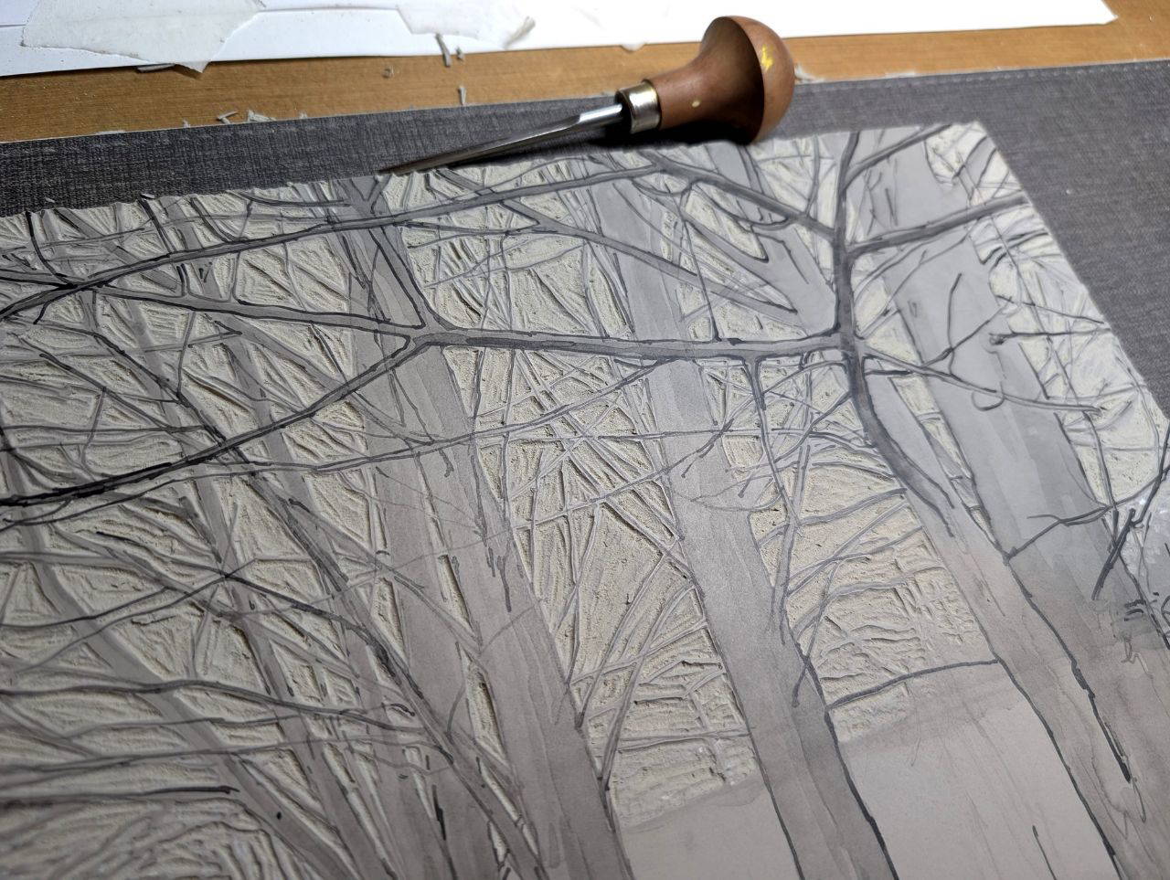 The piece I am currently working on is inspired by my local park. There are some trees I like by a small river – they have featured in a few of my prints now – I have a photo of them on a frosty, misty day which has lovely subtle colours. I like the way the trees fade into the mist and add depth. The branches of the trees are very complex and fun to cut. I am at the inevitable tricky mid-point of the work where I’m not sure whether I have done it all in the right order and if I will be happy with the result – I often have a difficult stage where I’ve tried to be a bit too clever and it hasn’t quite worked! Oh well, it wouldn’t be much fun if I made it too easy on myself! I like to make sure I am trying something new each time to keep it interesting and to ensure my practise is growing.