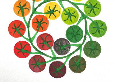 In 2022, prints are being created on the theme of food growing and gardening, to be sold in aid of two charities – Trussell Trust, supporting people in poverty with emergency food via food banks, and Edible Rotherhithe, providing gardening sessions to local communities and enabling creative learning opportunities in and outside of the classroom for disadvantaged children.