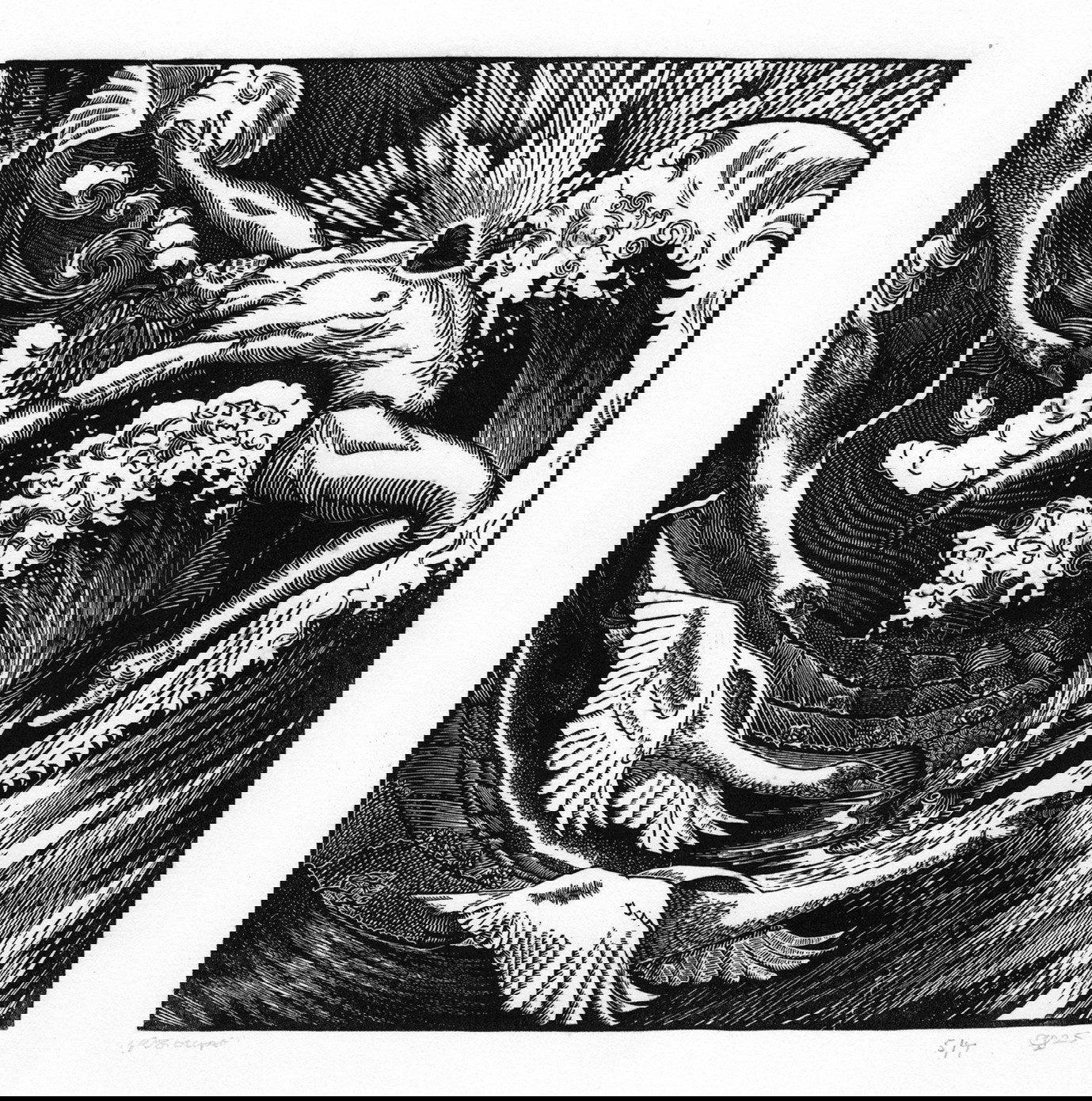 Grafik är något jag kom till genom ett intresse för japanska träsnitt; jag har en liten samling av dessa. Det som intresserade mig i japanskt träsnitt var den fysiska processen att göra trycken med mycket enkla material, allt görs med stor finesse och för hand. Processen kräver inte ens en press! Jag började med att lära mig att skära mina egna träsnitt i japansk stil och lärde mig snart att för att göra det bra behöver man mycket tid och mycket övning. Det är en process jag gillar mycket och fortfarande utforskar. Jag har också utforskat etsning, linoleumsnitt och träsnitt, som alla är tekniker man kan utforska på egen hand och med mycket grundläggande utrustning. Varje process erbjuder något annorlunda. Etsningsprocessen, särskilt torrnålsetning, är intressant eftersom den kan vara mycket mer intuitiv, det är som att rita och kan vara mycket lösare och uttrycksfull. Jag tycker att linoleumsnitt och träsnitt tilltalar formgivaren i mig och är därför mer noggrant planerade.