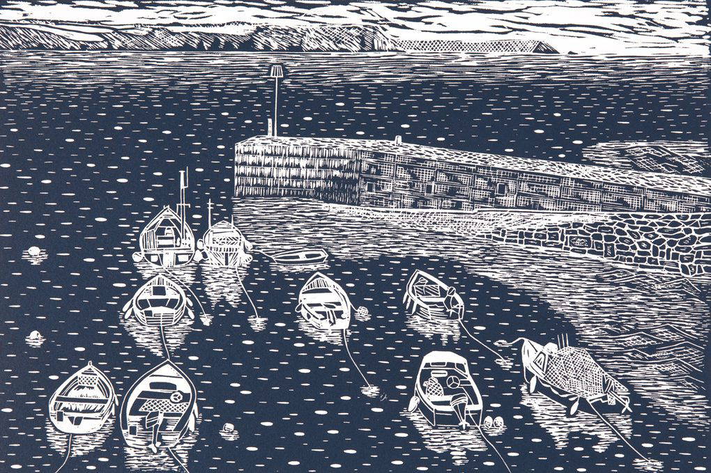Jag har många tryck som jag älskar och som betyder något för mig. Jag tror att mitt senaste tryck kanske (för närvarande!) är min favorit eftersom det representerar en "havsförändring" (ursäkta ordvitsen...) för mig både i stil och storlek på snideriet. Det är en hamnscen från mitt älskade Porthscatho och mitt största tryck hittills, fyra gånger så stort som mitt vanliga verk. Jag har också byggt upp självförtroendet att ta en mer grafisk inställning till kompositionen och lekt med perspektivet av horisonten och själva hamnen. Det var ett hjärtskärande ögonblick när jag drog det genom tryckpressen för första gången, men till min lättnad och glädje trycktes det vackert och jag känner att det verkligen representerar mig som konstnär i detta skede av min tryckresa.