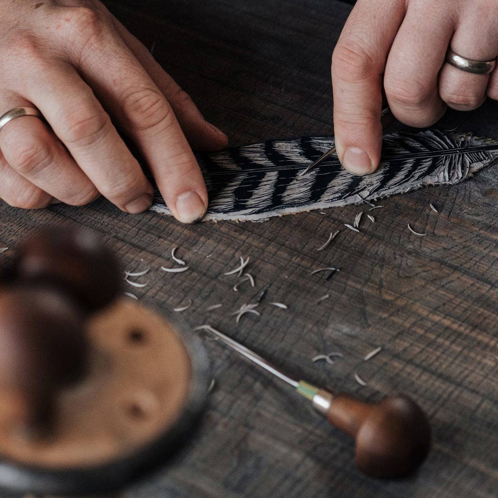 Vi har tur som bor i ett upp och nervänt hus med vårt vardagsrum och ateljé på övervåningen. Det är inte ett stort utrymme, men vi har enorma snedställda fönster i takfoten som släpper in massor av ljus – faktiskt för mycket ibland eftersom ateljén blir extremt varm på sommaren! Jag snickrar ibland i ateljén men väljer ofta en lugn plats någonstans runt huset och jag tar också med mig mitt linoleumspapper och mina verktyg ner till kolonilotten för inspiration medan vi skördar våra grönsaker. Vi gör regelbundna resor hem till Cornwall och mitt linoleumspapper och en smal verktygslåda följer med mig varje gång i ryggsäcken, redo för inspirationsstunder vid kusten.