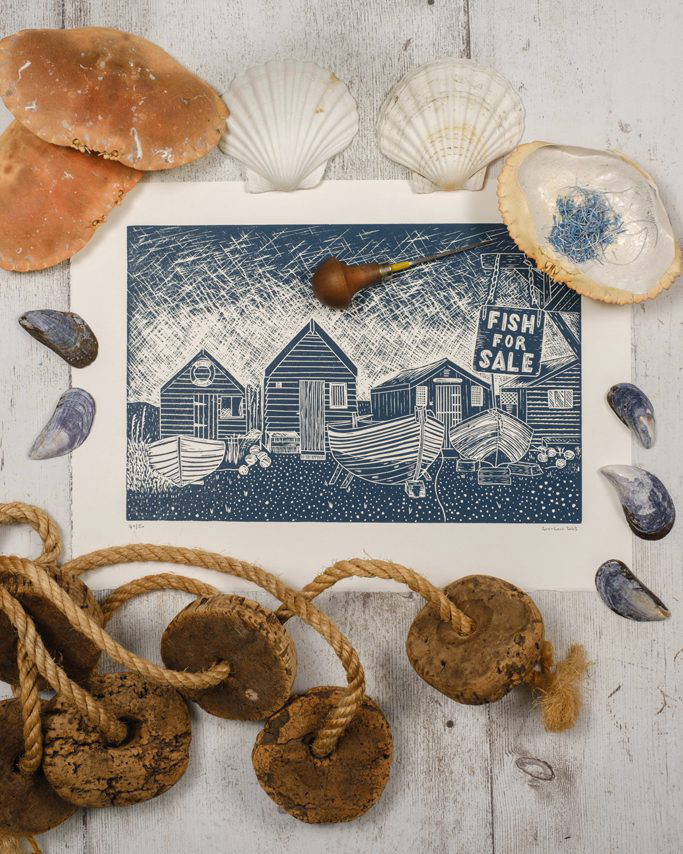 Mina dagar är ganska varierade och det är det jag älskar med mitt arbete. Vissa dagar snidar jag hela dagen, andra dagar trycker jag hela dagen, de flesta dagar gör jag lite av varje. När jag trycker är det under en bra tid, minst fyra timmar. Jag kommer in i en rytm och siktar på att producera mellan 20-30 tryck på en gång – då känner jag att jag har åstadkommit något. Och när man väl har fått studion helt täckt av bläck och man är i ett bra flow är det synd att stanna upp och städa upp! Fotografering håller mig väldigt upptagen under vår- och sommarmånaderna, men jag tänker alltid på nya linoleumidéer samt producerar och säljer mina verk. Jag har flera Makers-marknader under hela året och har ofta ett stånd på vår traditionella Thame-marknad på tisdagar. Min onlineförsäljning växer ständigt så jag lägger också tid på att upprätthålla lagernivåer och behandla beställningar. Jag har turen att ha en deltidsanställd som också hjälper till en gång i veckan så att jag kan koncentrera mig på det kreativa.