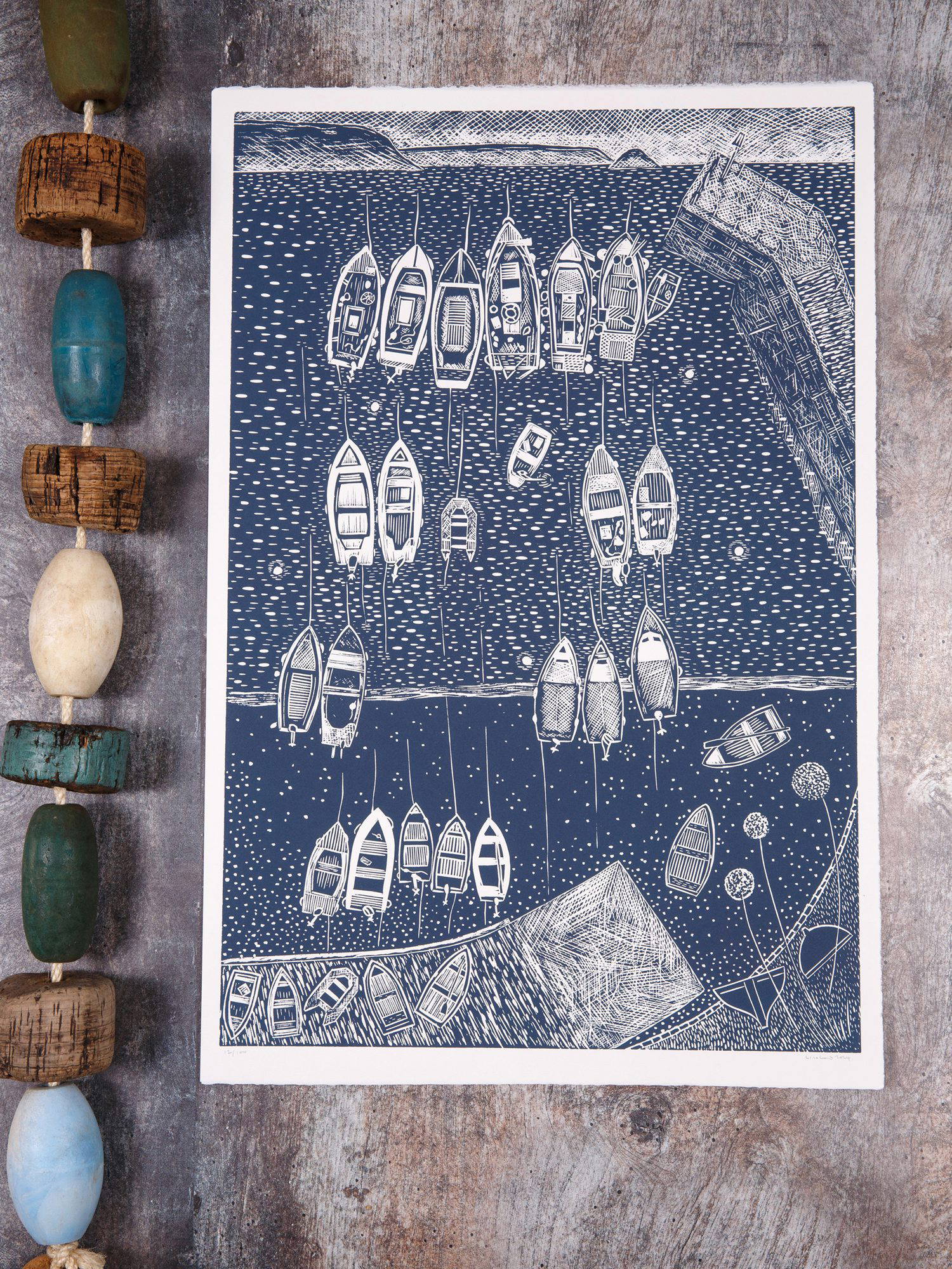 Min stil är definitivt influerad av min fotografering och att se världen genom en lins. Mina linoleumtryck är ganska grafiska och jag tycker om att leka med negativa former såväl som själva motivet. Jag brukar arbeta i en färg – min egen.Lino Lord Lugger BlåEn fyllig blå/svart färg, jag tycker att den passar mitt arbete som ofta är influerat av havet och mina korniska rötter. Den passar också bra i folks hem, vilket är viktigt.